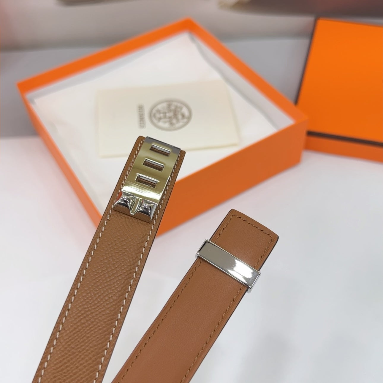 • H Buckle in permabrass plated metal.